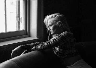 My goal in portraits like this is always to convey both vulnerability and strength—to capture a cinematic stillness that invites the viewer in. I shot this on the second floor of a historic building where soft natural light was streaming in through the tall windows. I noticed how the light highlighted her hair and asked her to rest against the sofa in thoughtful stillness. The curve of the davenport naturally leads the eye to her, making it a subtle compositional anchor. Lighting was the biggest challenge—balancing shadow and highlight without losing detail or mood. Shooting wide helped maintain that soft, cinematic depth.